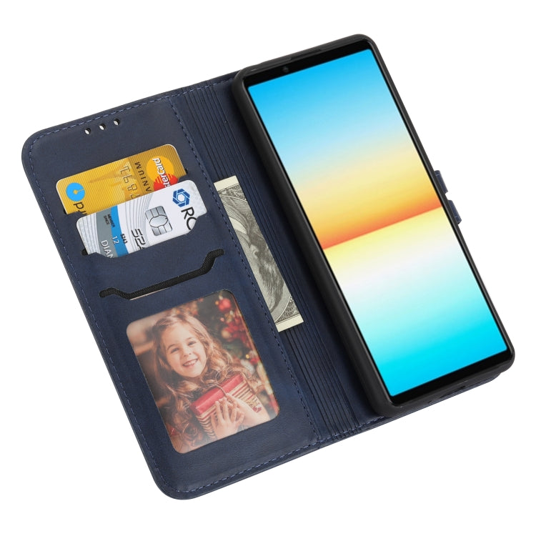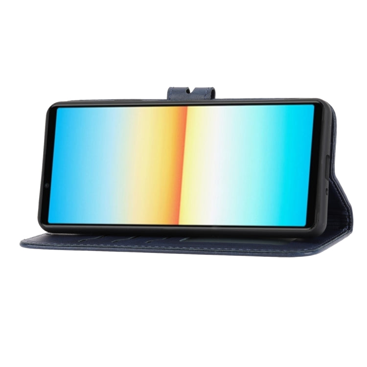 Estuche de Cuero para Sony Xperia 10 IV con Patrón de Gato Feliz en Relieve (Azul)