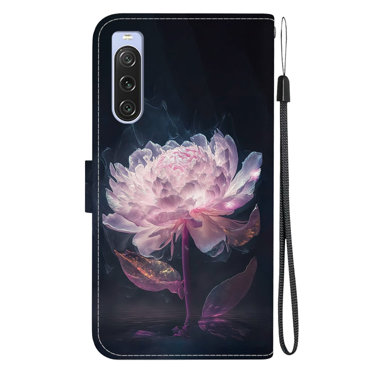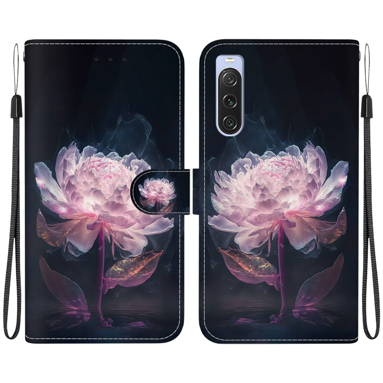 Estuche de Cuero para Sony Xperia 10 V (2023) con Dibujo Coloreado y Textura de Cristal (Peonía Púrpura)