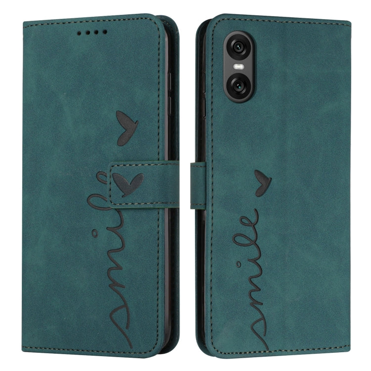 Funda de Cuero Skin Feel Heart para Sony Xperia 10 Vi con Relieve y Cordón Largo (Verde)