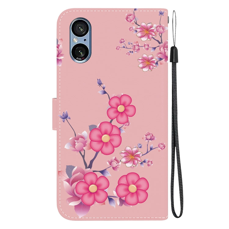 Funda de Cuero para Sony Xperia 5 V con Dibujo Coloreado y Textura de Cristal (Flores de Cerezo)