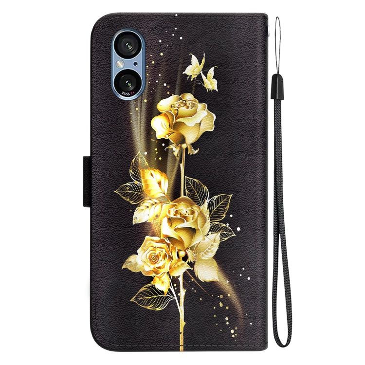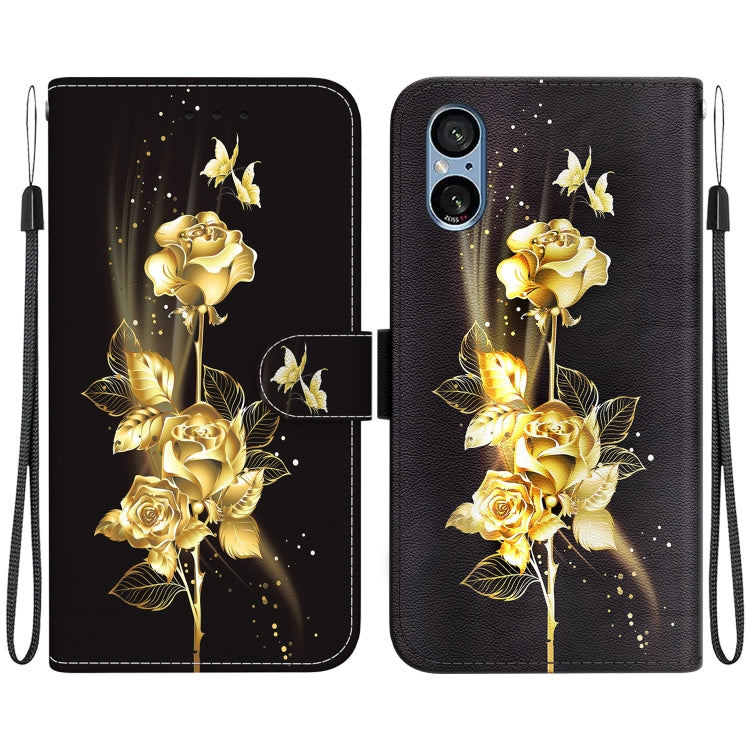 Funda de Cuero para Sony Xperia 5 V con Dibujo Coloreado y Textura de Cristal (Mariposa Dorada Rosa)
