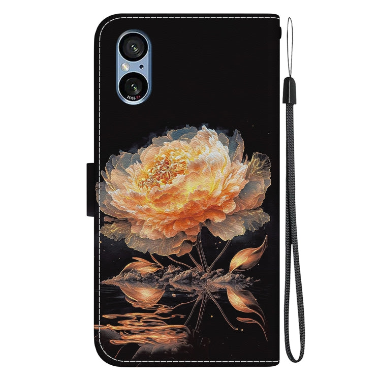 Funda de Cuero para Sony Xperia 5 V con Dibujo Coloreado y Textura de Cristal (Peonía Dorada)