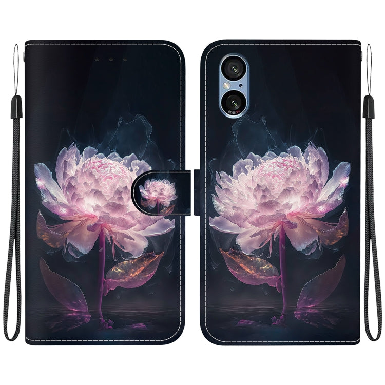 Funda de Cuero para Sony Xperia 5 V con Dibujo Coloreado y Textura de Cristal (Peonía Púrpura)