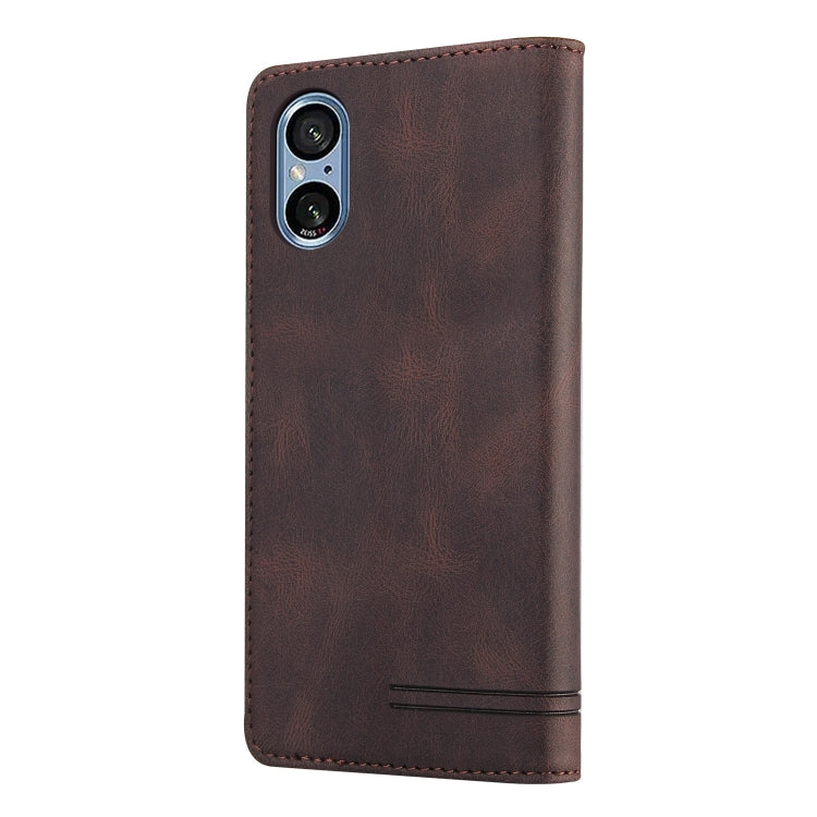 Funda de Cuero para Sony Xperia 5 V Skin Feel con Tapa Horizontal, Cepillo Antirrobo y Soporte (Marrón)
