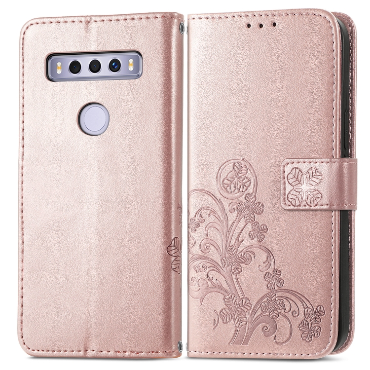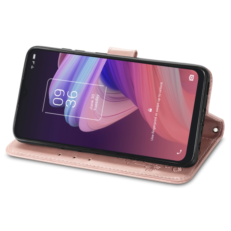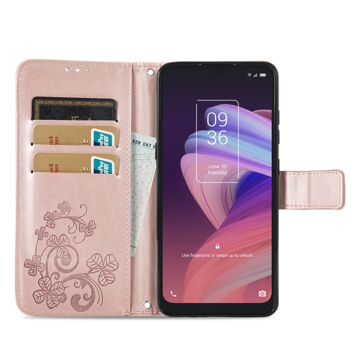 Funda de Cuero para TCL 10 Se con Hebilla en Relieve de Cuatro Hojas (Gold Rose)