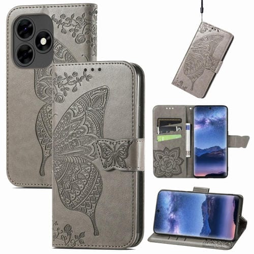 Funda para Tecno Itel S23 de Cuero con Relieve Flor y Mariposa (Gris)