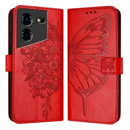 Funda de Cuero para Tecno Pova 5 Pro 5G con Mariposa en Relieve (Rojo)