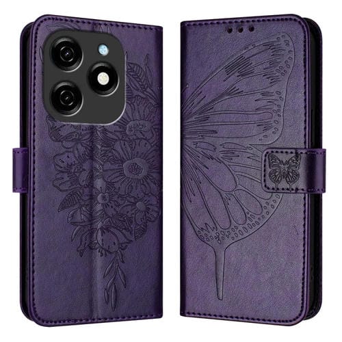 Funda de Cuero para Tecno Spark 20 con Mariposa en Relieve (Púrpura Oscuro)