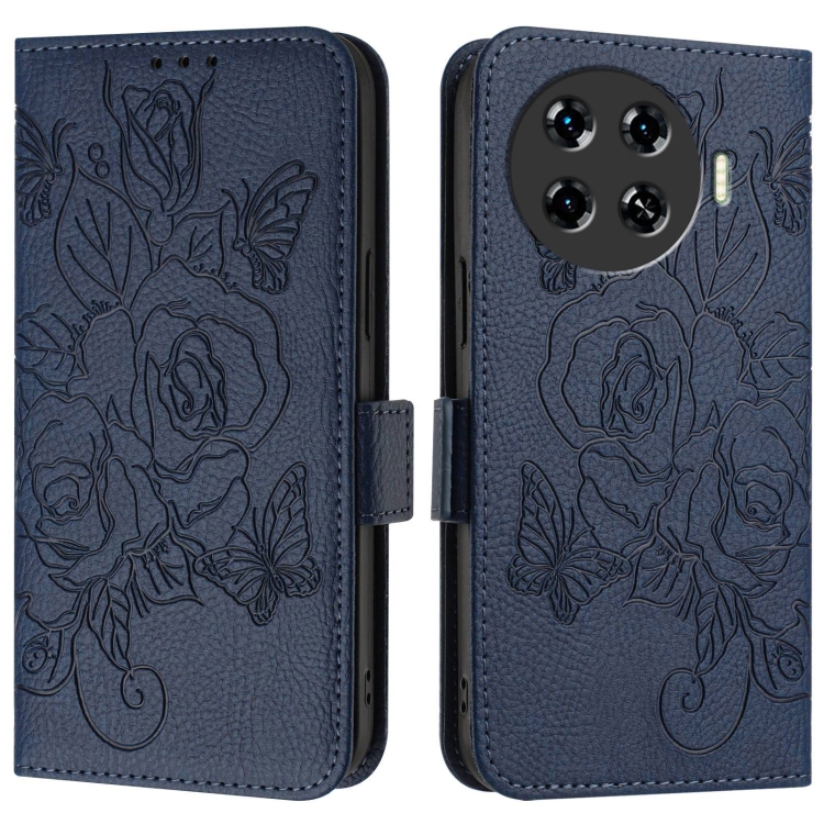 Funda para Tecno Spark 20 Pro de Cuero Antirrobo RFID con Rosa en Relieve (Azul Oscuro)