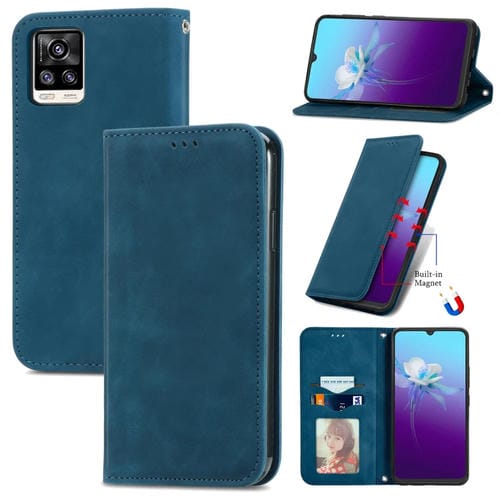 Para Vivo V20 2021 Retro Siente la Piel Magnético Funda de Cuero Horizontal Flip con Soporte y Ranuras para Tarjetas y Marco de Fotos (Azul)