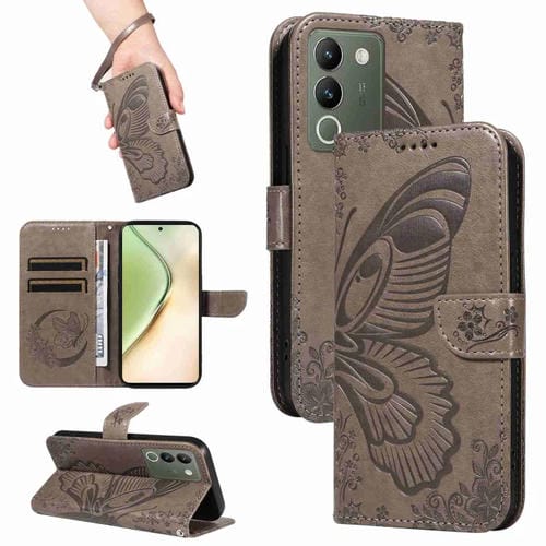 Para Vivo V29E / Y200 5G Funda para Teléfono de Cuero con Relieve de Mariposa y Cola de Golondrina (Gris)