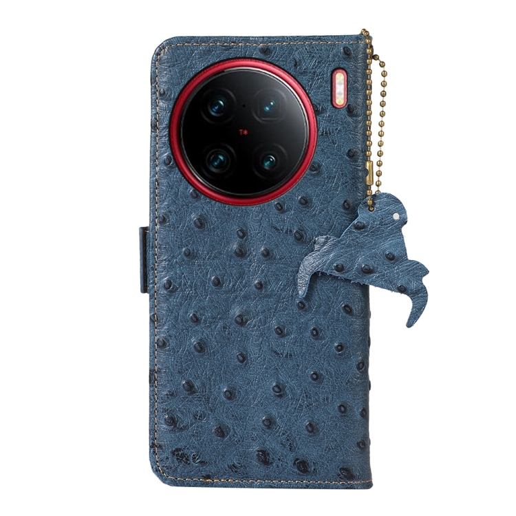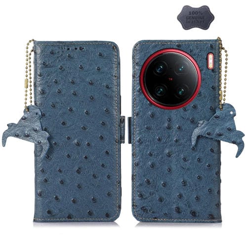 Para Vivo X90 Pro + Patrón de Avestruz Funda de Teléfono Rfid de Cuero Genuino (Azul)