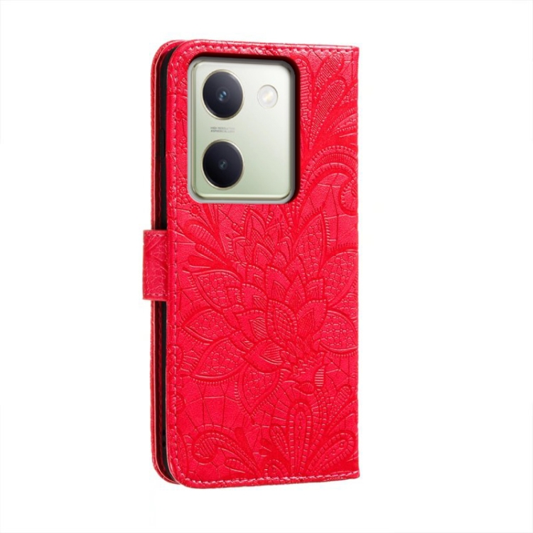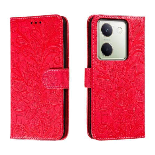 Para Vivo Y100 5G Funda para Teléfono de Cuero con Tapa y Estampado de Flores de Encaje (Rojo)
