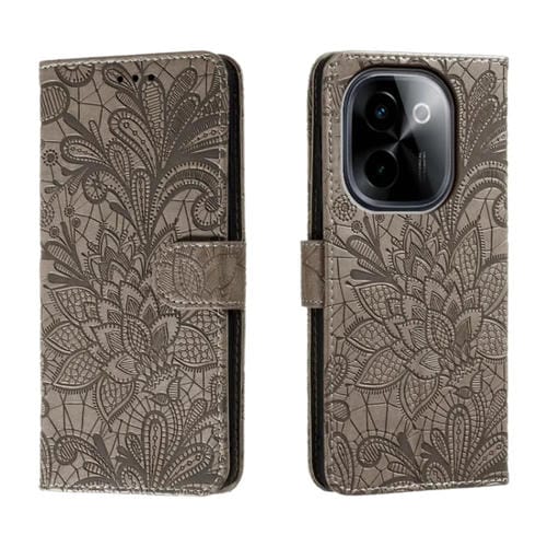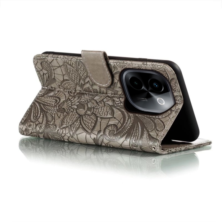 Para Vivo Y200 5G Funda para Teléfono de Cuero con Tapa y Estampado de Flores de Encaje (Gris)
