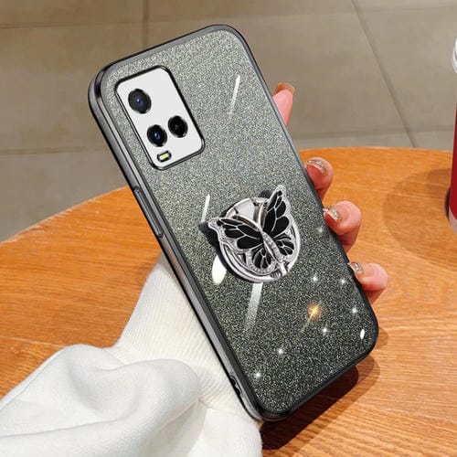 Para Vivo Y21 Funda para Teléfono de TPU con Soporte de Mariposa con Brillo Degradado Plateado (Negro)