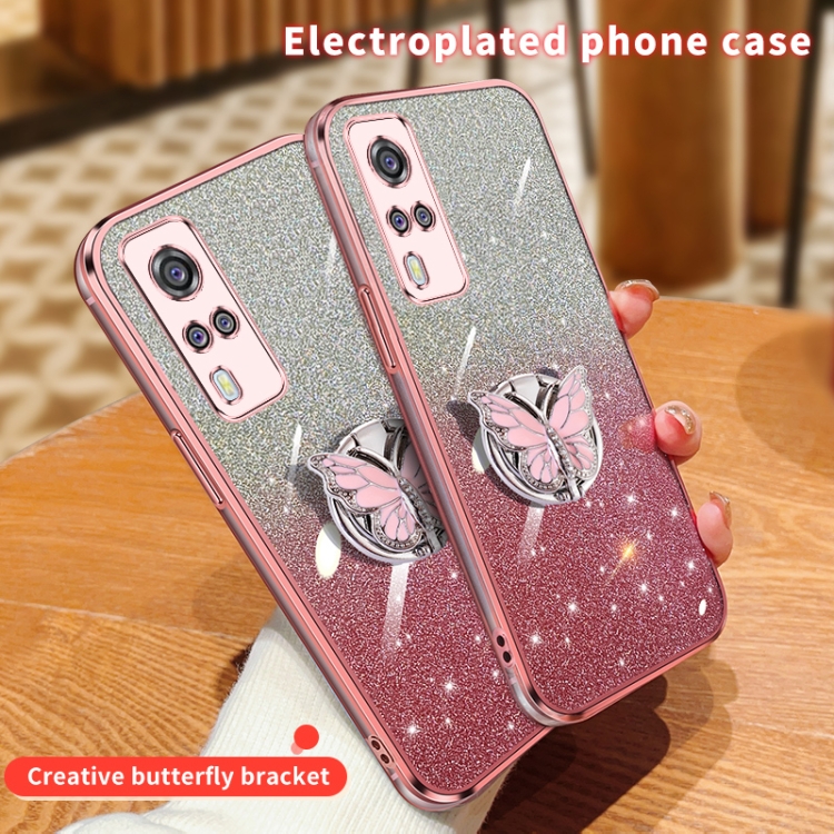 Para Vivo Y51 2021 Funda para Teléfono de TPU con Soporte de Mariposa y Brillo Degradado Plateado (Rosa)
