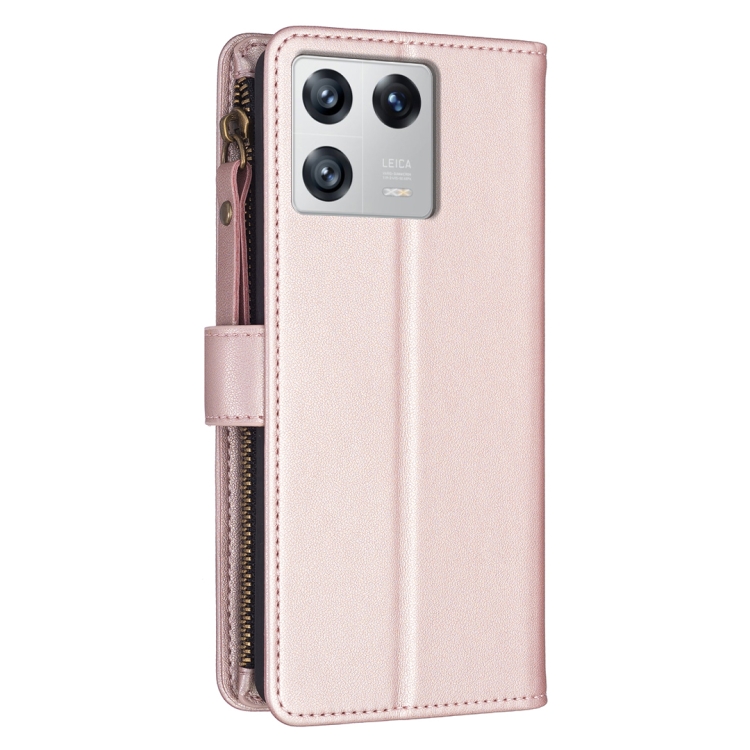 Para Xiaomi 13 9 Ranuras para Tarjetas Cremallera Cartera Funda de Cuero con Tapa para Teléfono (Oro Rosa)
