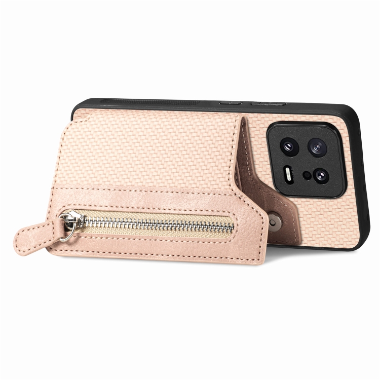 Para Xiaomi 13 Carbon Fiber Flip Zipper Wallet Phone Case (Caqui)