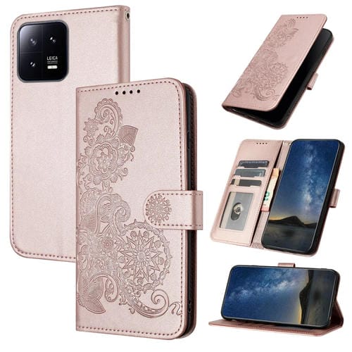 Para Xiaomi 13 Datura Flower Funda de Teléfono de Cuero con Tapa En Relieve (Oro Rosa)