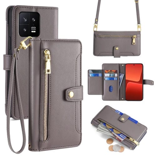 Para Xiaomi 13 Funda de Cuero para Teléfono con Billetera con Cremallera y Cuerpo Cruzado con Textura de Oveja (Gris)