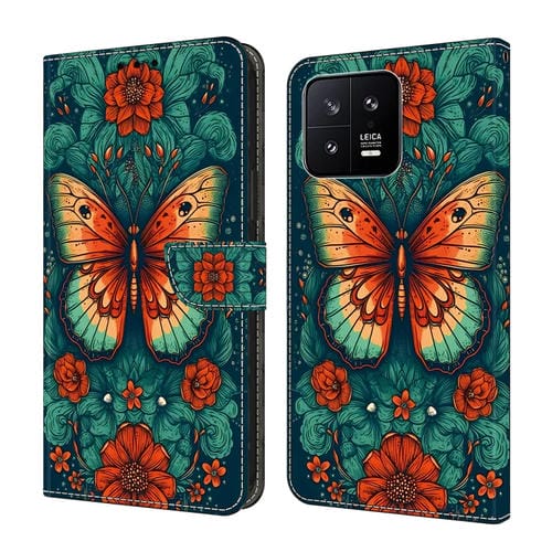 Para Xiaomi 13 Funda de Cuero Pintada con Cristales (Mariposa de Flores)