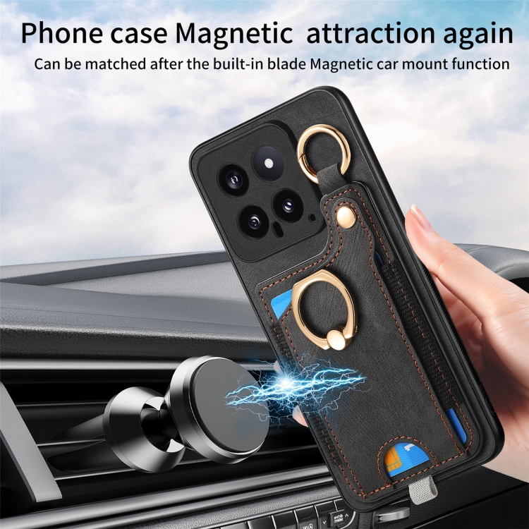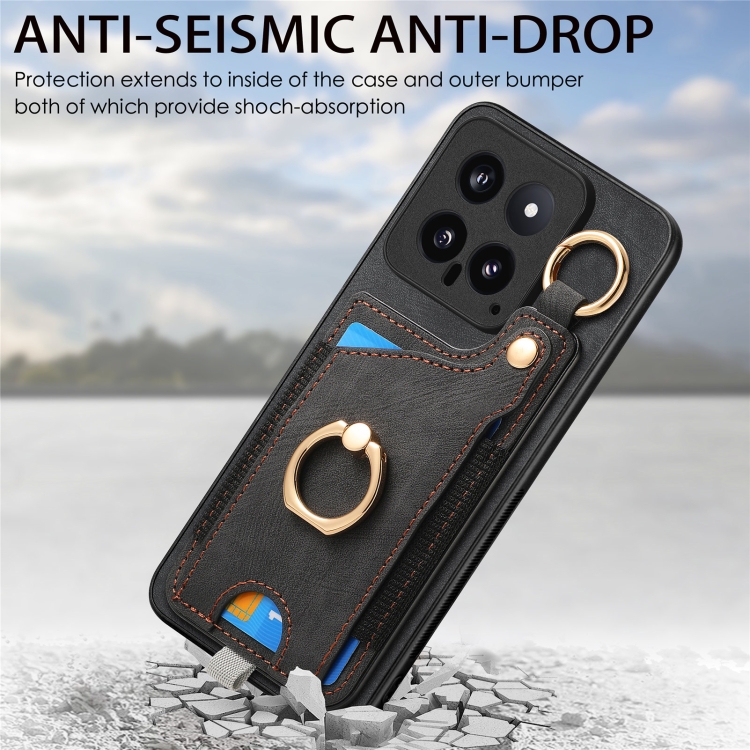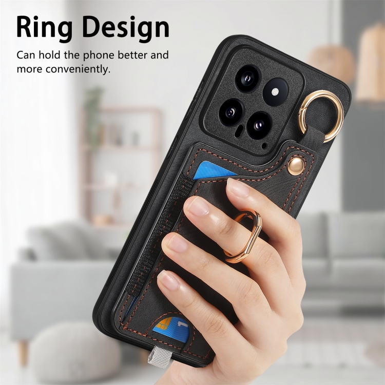 Para Xiaomi 14 Funda Para Teléfono Con Bolsa Para Tarjeta Con Anillo Y Sensación De Piel Retro Con Lazo Para Colgar (Negro)