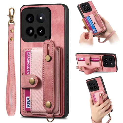 Para Xiaomi 14 Retro Cross Muñequera Monedero Funda Trasera De Cuero Para Teléfono (Rosa)