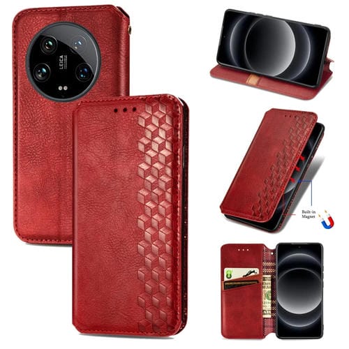 Para Xiaomi 14 Ultra Cubic Grid Funda De Teléfono De Cuero Magnético Prensado (Rojo)