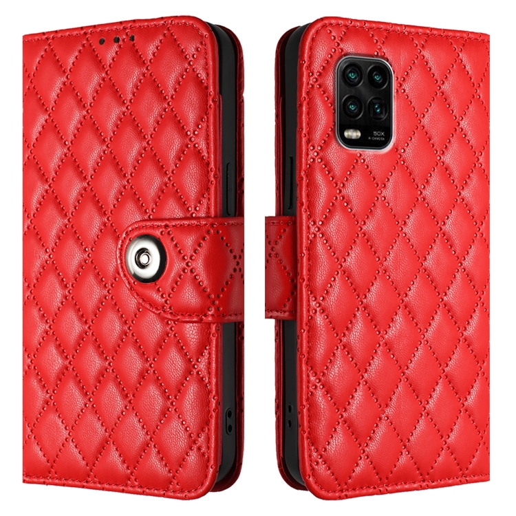 Para Xiaomi Mi 10 Lite 5G Funda para Teléfono de Cuero con Tapa con Textura Romboidal y Cordón (Rojo)