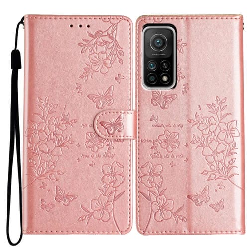 Para Xiaomi Mi 10T 5G Funda de Cuero para Teléfono con Mariposas y Flores (Oro Rosa)