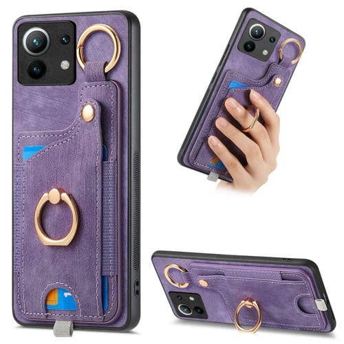 Para Xiaomi Mi 11 Funda para Teléfono con Bolsa para Tarjeta con Anillo y Sensación de Piel Retro con Lazo para Colgar (Púrpura)