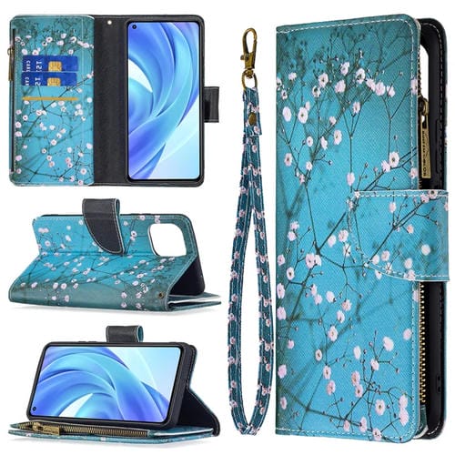 Para Xiaomi Mi 11 Lite Patrón de Dibujo de Color Cremallera con Cremallera de Cuero Horizontal Flip Funda con Soporte y Tragamonedas y Billetera (Flor de Ciruela)