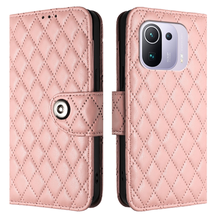 Para Xiaomi Mi 11 Pro Funda de Cuero con Tapa con Textura Rómbica y Cordón (Rosa Coral)