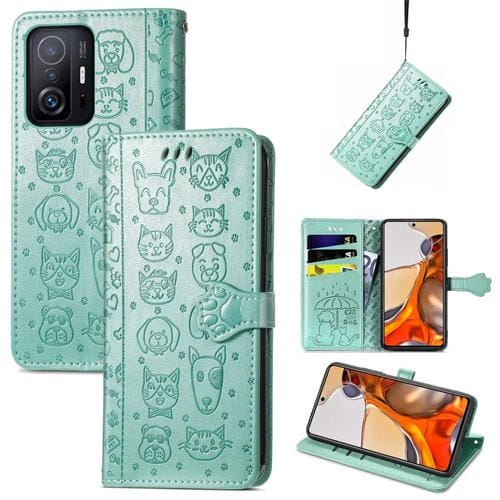 Para Xiaomi Mi 11T / 11T Pro Cat y Estuche de Cuero Horizontal En Relieve para Perros con Soporte y Ranura para Tarjeta y Billetera y Cordón (Verde)