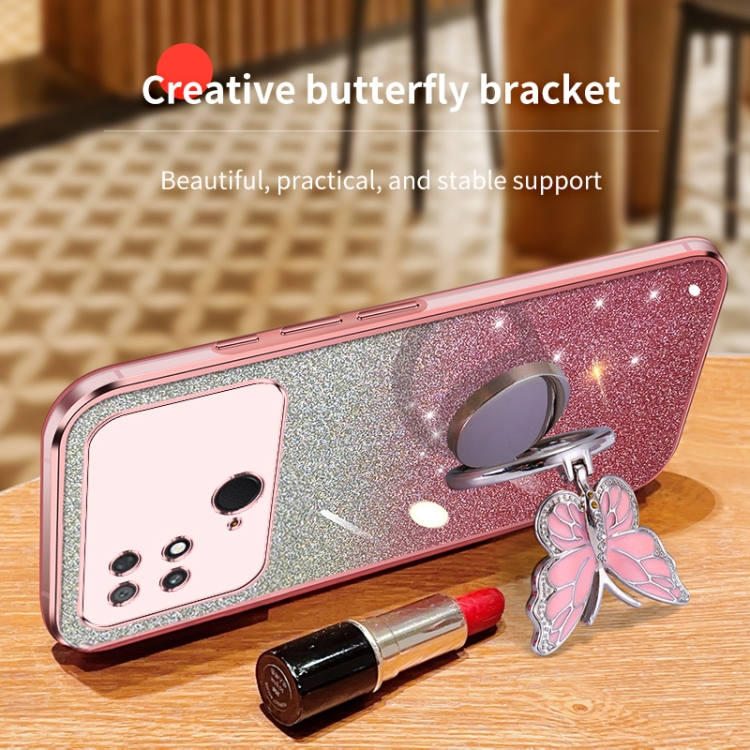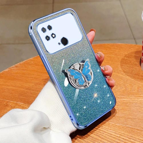 Para Xiaomi Poco C40 Funda para Teléfono de TPU con Soporte de Mariposa con Brillo Degradado Plateado (Azul Sierra)