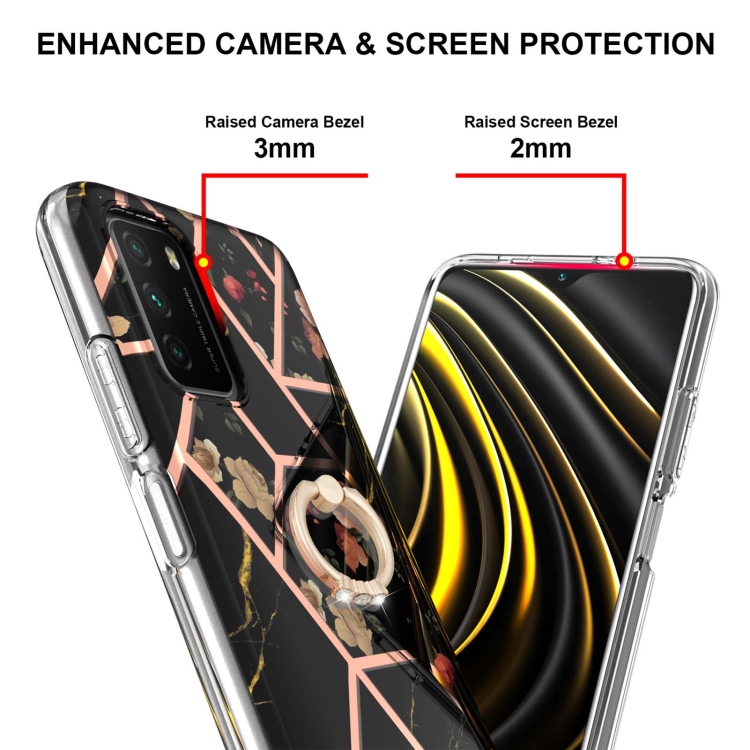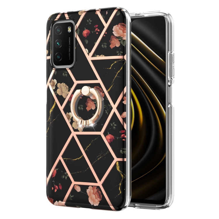 Para Xiaomi Poco M3 / Redmi Note 9 4G / REDMI 9 POWER / REDMI 9TELECTROPLATING Empalme Patrón de flores de mármol TPU Funda a prueba de golpes con soporte de anillo de diamantes de imitación (flor negra)
