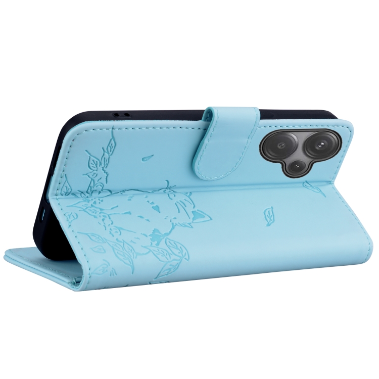 Para Xiaomi Poco M6 4G Funda de Teléfono de Cuero con Relieve de Gato Lindo (Azul Cielo)