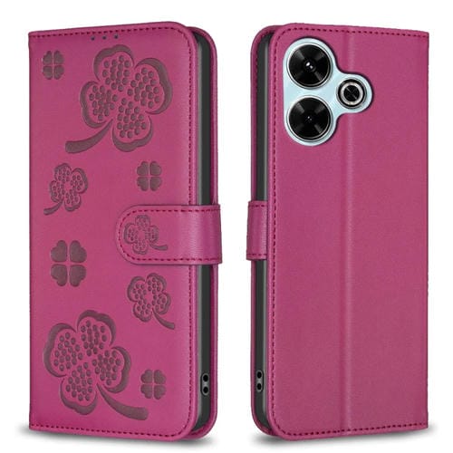 Para Xiaomi Poco M6 4G / Redmi 13 4G Funda para Teléfono de Cuero con Relieve de Cuatro Hojas (Rojo Rosa)