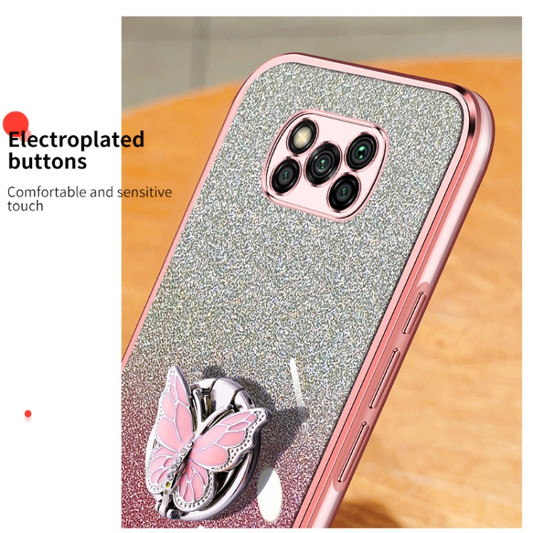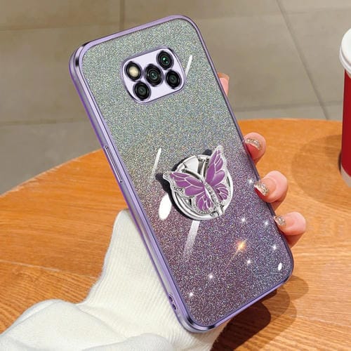 Para Xiaomi Poco X3 Funda para Teléfono de TPU con Soporte de Mariposa con Brillo Degradado Plateado (Púrpura)