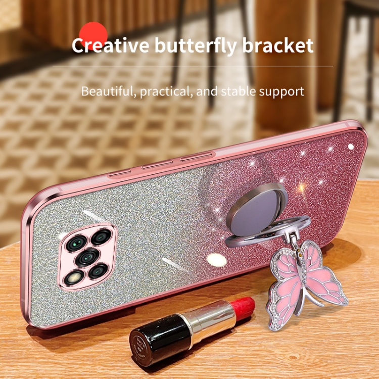 Para Xiaomi Poco X3 Funda para Teléfono de TPU con Soporte de Mariposa con Brillo Degradado Plateado (Rosa)
