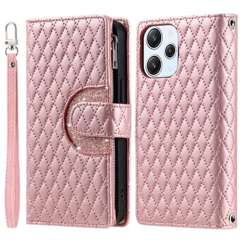 Para Xiaomi Redmi 13 4G Glitter Lattice Zipper Wallet Funda de Cuero para Teléfono (Oro Rosa)