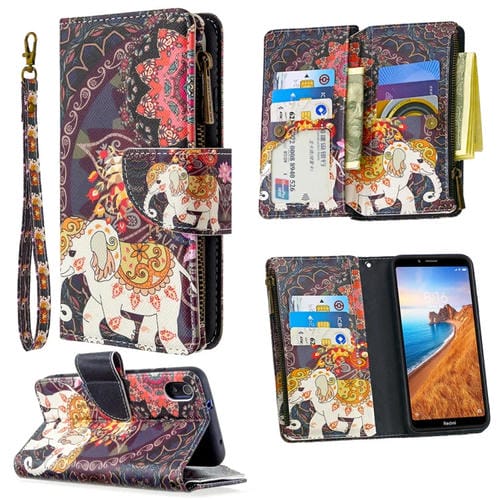 Para Xiaomi Redmi 7A Patrón de Dibujo de Colores Cremallera Funda de Cuero con Tapa Horizontal con Soporte y Ranuras para Tarjetas y Billetera (Elefantes de Flores)