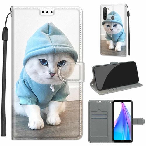 Para Xiaomi Redmi Note 8T Tenso de Voltaje Dibujo de Color Magnético Clascar Horizontal Flip Pu Funda de Cuero con Soporte y Ranuras de Tarjetas (C15 Suéter Azul Blanco Gato)