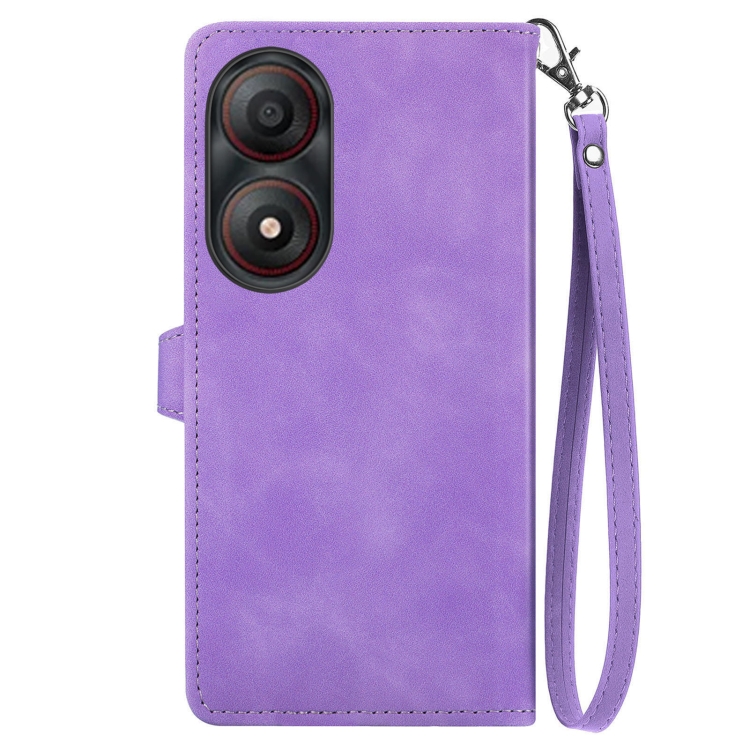 Funda de Cuero para ZTE Blade A34 con Cremallera y Flores en Relieve (Púrpura)