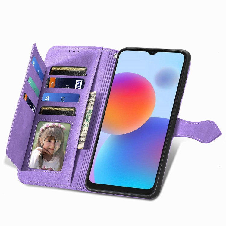 Estuche para ZTE Blade A52 de Cuero con Cremallera y Flor en Relieve (Púrpura)