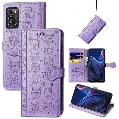 Estuche de Cuero para ZTE Blade A72 4G con Relieve de Gato y Perro (Púrpura)