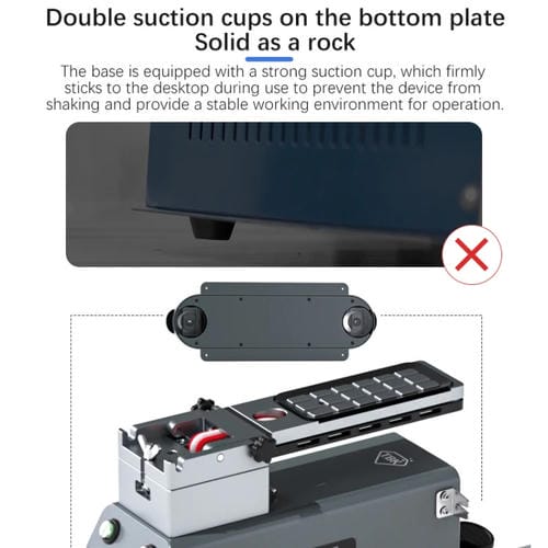 • Potencia: 150 W; Tamaño: 34 x 13 x 16,5 cm; Peso: 3 kg; Plataforma de trabajo: 160 x 55 mm; Rango de temperatura: 0-120 °C; Sistema de calefacción termostático de temperatura constante; Succión súper fuerte; Plataforma Flexible y rotatoria; Base con ventosa para mayor estabilidad