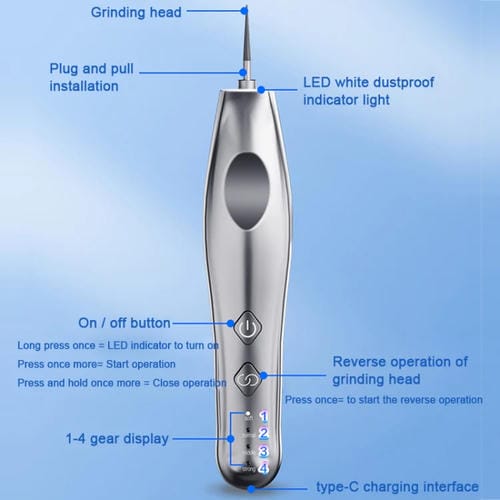 - Velocidad máxima de 20,000 RPM; Batería de 500mA; iluminación LED Frontal; sistema de amortiguación incorporado; función a Prueba de Polvo