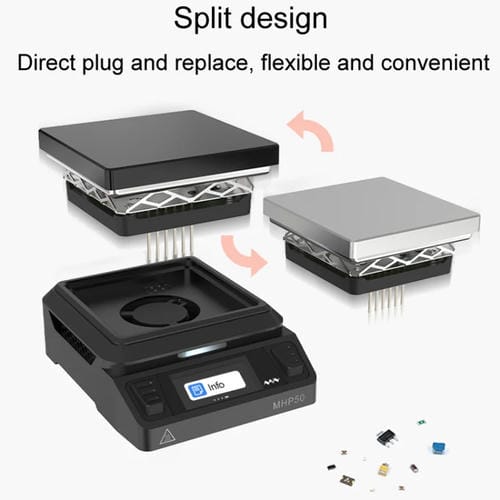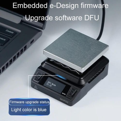 La estación de calefacción Miniware Mhp50 modelo A5 es una plataforma de reparación diseñada para ofrecer un control preciso y eficiente en procesos de desoldado y calentamiento. Compatible con fuentes de Alimentación PD y DC, esta estación integra un mini termostato de alta potencia con capacidad de hasta 150 W, lo que permite un calentamiento rápido y estable en un área de 50 x 50 mm. Su diseño compacto con altura reducida mejora la estabilidad durante su uso, evitando vuelcos accidentales. Dispone de una Pantalla LCD a color que muestra la temperatura en tiempo real y una luz indicadora que cambia de color según el nivel de calor, facilitando la supervisión visual. La estación permite configurar temperaturas y tiempos de calentamiento en secciones, simulando la función de un horno de reflujo para un control inteligente y preciso. Además, incluye funciones de seguridad como la detección de inclinación para detener el calentamiento y un firmware optimizado para una experiencia mejorada. Su Carcasa está fabricada en aleación de aluminio, garantizando durabilidad y disipación térmica eficiente.