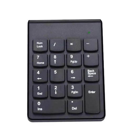 - 18 teclas numéricas, alcance Inalámbrico de 10 metros, Alimentación mediante 1 Batería AAA (no incluida), diseño ergonómico con inclinación de 15 grados